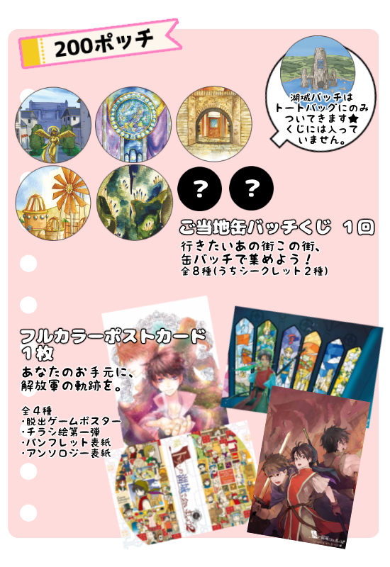 こちらはパンフレットに、バッグとクリアファイル、そしてポッチ札が付いたセット。